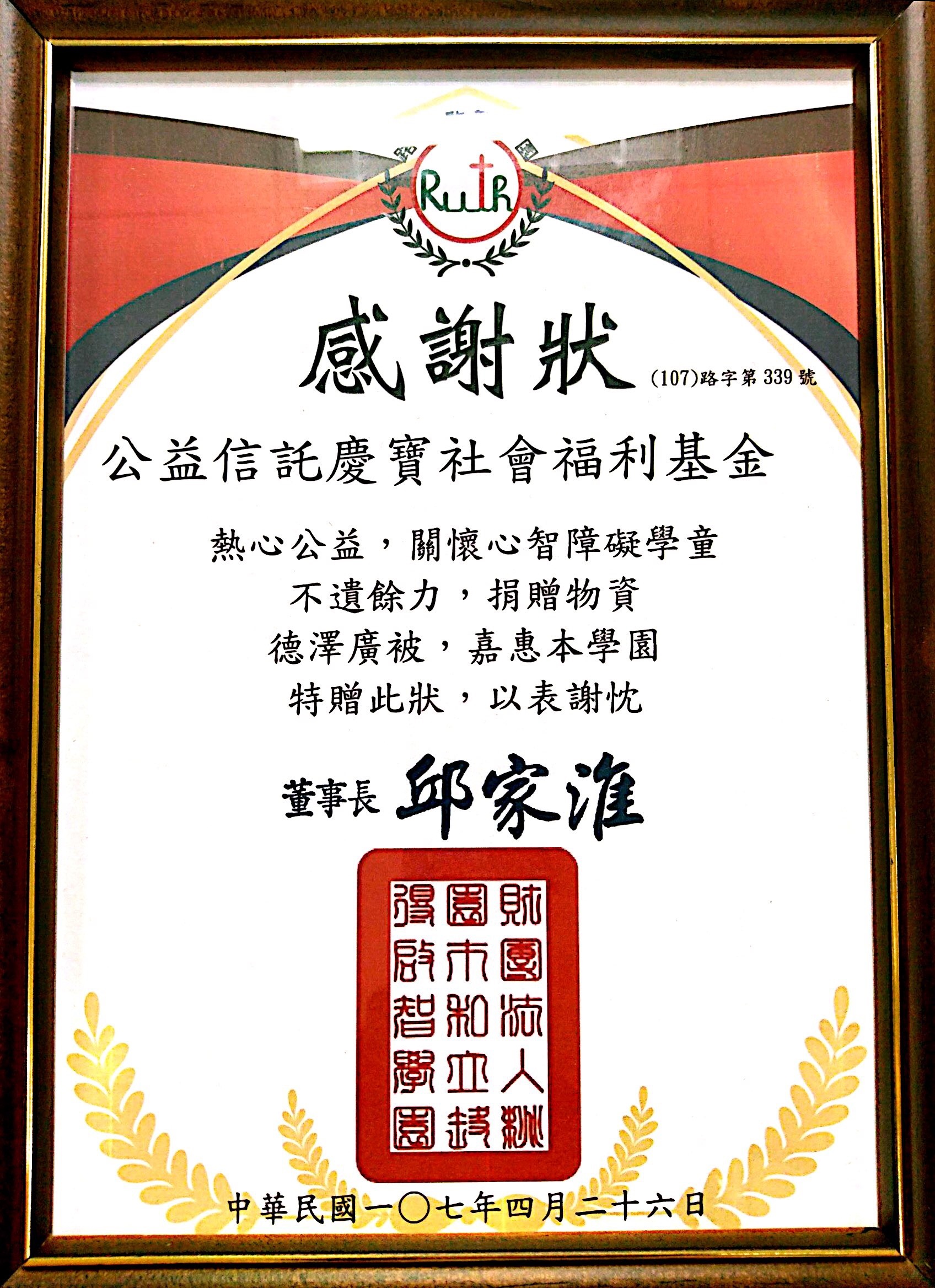 慶寶公益信託獲桃園市路得啟智學園致贈白米捐贈感謝狀